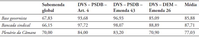 O governo contou com o voto disciplinado da bancada sindical a favor da criação da Funpresp (Tabela 2). Em momentos cruciais da votação do regime próprio de previdência dos servidores públicos federais, a fidelidade da bancada sindical superou a disciplina da própria base aliada. A base governista manteve-se disciplinada com votação média favorável de 85,88%. Nas mesmas votações, a bancada sindical apresentou disciplina média de 87,71%.