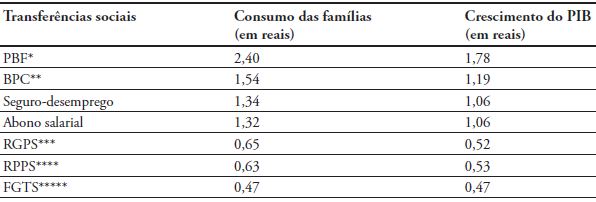 Os efeitos apresentados pelas transferências previdenciárias são bem menores do que 1, em contraposição às demais. A explicação é que esses recursos são apropriados, sobretudo, pelos mais ricos. Com isso, a maior parte dessa renda tende a ser convertida em poupança e não em consumo (Neri, Vaz e Souza, 2013). Esse tipo de análise econômica fundamenta a discussão em torno da relevância do componente de renda, direcionado às famílias pobres, para as economias locais.