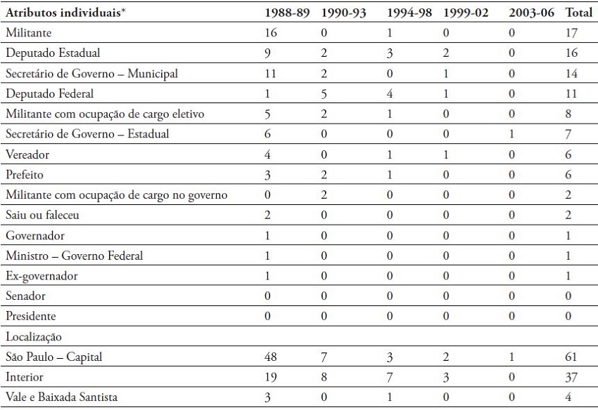 O primeiro, de natureza socioeconômica, se relaciona com diferentes experiências associativas das coalizões dominantes. No PSDB, predominam elites políticas profissionais de classe média e alta, com perfil mais conservador no interior do estado, cuja experiência associativa está ligada, principalmente, a associações profissionais liberais e empresariais. No PT, por sua vez, o grupo dominante é composto por lideranças operárias, elites profissionais e intelectuais, mais fortemente concentrado nas regiões metropolitanas e municípios de maior densidade populacional, com predominante experiência associativa sindical.
