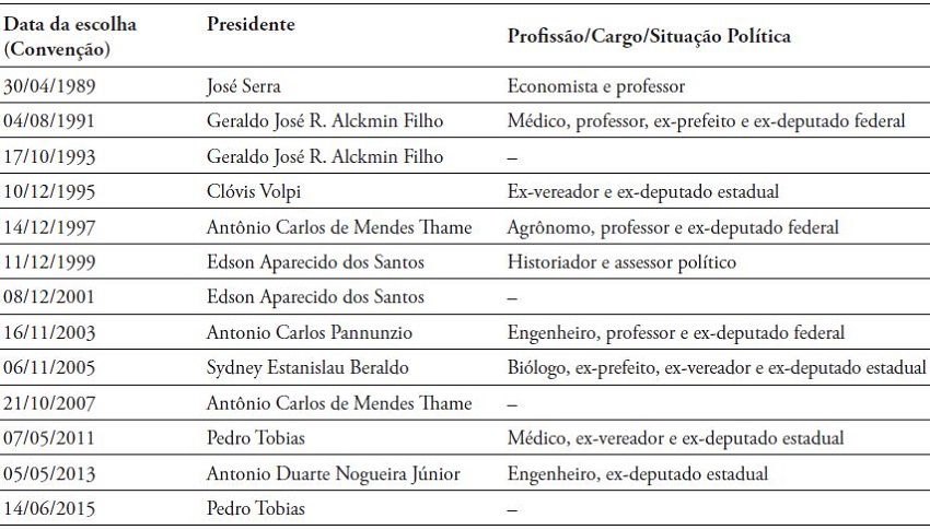 A Tabela 2 traz informações sobre os presidentes do PSDB paulista, evidenciando a origem de suas elites político-partidárias nos Legislativos estadual e nacional como nos grupos políticos que controlaram o partido no estado desde a sua criação, em fins dos anos de 1980. Como podemos verificar, todos eles são políticos profissionais com bases eleitorais no interior e ligados aos grupos dominantes em cada período (Serra/FHC, Covas, Alkmin).