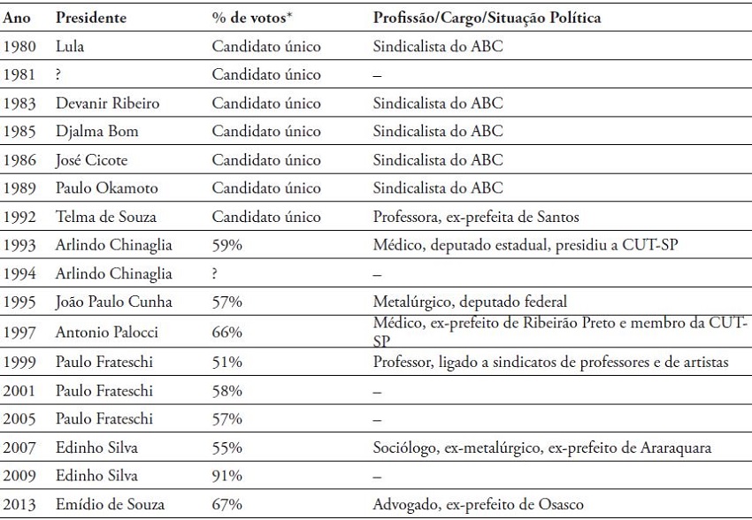 O principal ponto de apoio para a construção das bases partidárias petistas paulistas foram os sindicatos e os movimentos operários (Meneguello, Amaral e Bizzarro Neto, 2014; Nafalski e Pessoa Júnior, 2015).15 Isso pode ser observado na Tabela 3, a qual mostra que todos os presidentes da seção paulista do PT foram lideranças sindicais, membros da Central Única dos Trabalhadores (CUT) ou ligados de algum modo ao mundo do trabalho. Mesmo no caso de profissionais liberais, artistas ou intelectuais, suas identidades eram mais próximas ao perfil dominante dentro do partido. Em todos os casos, eles se elegeram como candidatos únicos, sem competidores. Em segundo lugar, destacam-se líderes pertencentes à categoria de profissionais liberais e grupos intelectuais. Além disso, de acordo com Nafalski e Pessoa Júnior (2015), todos são oriundos da tendência petista denominada Campo Majoritário e ligados ao ex-presidente Lula.