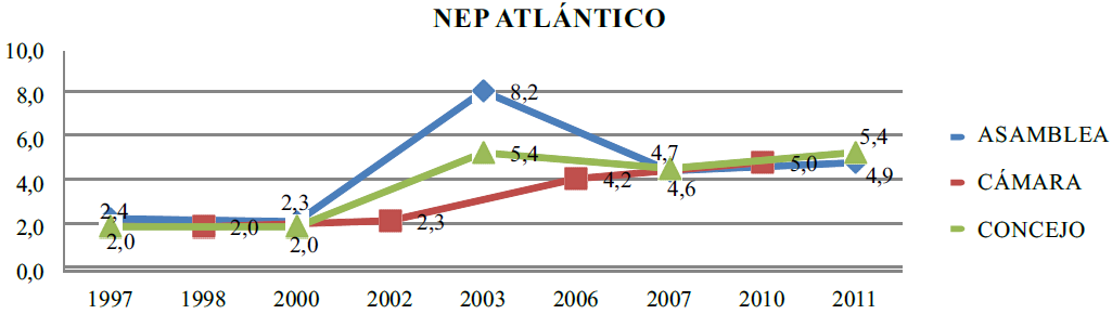 En primer lugar, las diferencias en el NEP (Gráfico 1, 2, 3, 4) señalan que cada sistema subnacional es único, al igual que los efectos que tienen los cambios en las reformas políticas y electorales sobre ellos. Comparando los tres niveles de elección en cada departamento, Atlántico (Gráfico 1) es el que presenta menores diferencias en las dinámicas de competencia entre niveles antes de la reforma de 2003 (más nacionalizado), mientras que en los otros (gráficos 3 a 4) hay mayor ilación solo entre las elecciones locales y regionales (con poco más de dos partidos -los tradicionales-) y se presenta más volatilidad en las de Cámara con un aumento constante del NEP (que en algunos casos es superior a tres). Esta dinámica es fruto de la incursión de nuevos movimientos políticos, que logran posicionarse en algunos departamentos y niveles electorales como alternativa a los tradicionales (Gutiérrez, 2007).