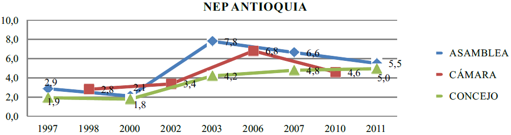 De otro lado, la instauración de la lista única y la prohibición de la doble militancia en el 2003, se constituyeron en incentivos para que algunos candidatos –con suficiente capital electoral– optaran por crear su propio partido, permitiéndoles seguir en competencia y con posibilidades de obtener una curul sin ser subsidiarios de las etiquetas tradicionales. Lo anterior puede leerse en el crecimiento exagerado del NEP durante este año en todos los departamentos, evidenciando con sus diferencias entre niveles de elección una desconexión entre todos ellos, es decir, el sistema está menos nacionalizado en comparación con la década anterior (gráfico 1, 2, 3, 4).