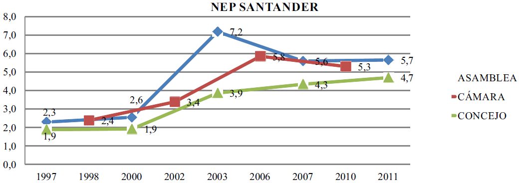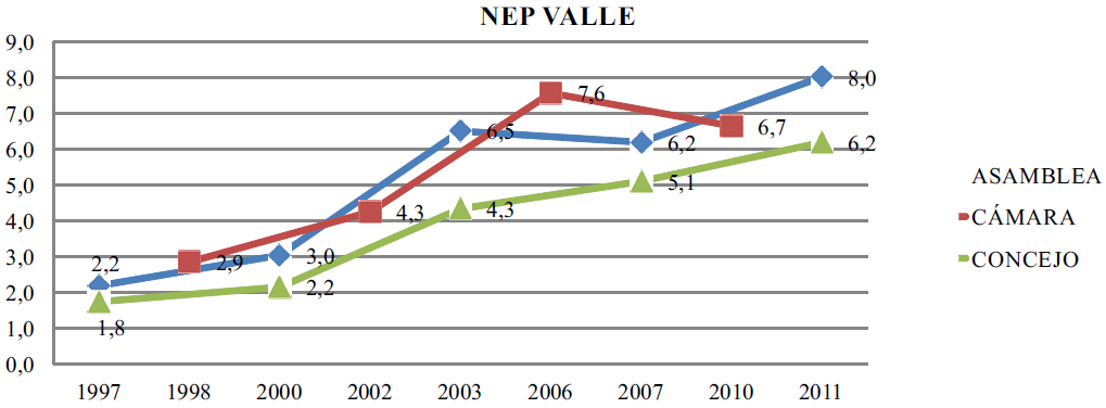 En los años posteriores, fruto del reacomodo de los partidos, los resultados por departamento exhiben diferencias entre las distintas elecciones. Nuevamente, Atlántico tiende a una mayor ilación entre todos los niveles (es el más nacionalizado) pero con un aumento constante en la fragmentación (más movimientos en competencia). En Antioquia y Santander el NEP de Asamblea y Cámara parecen estar más ligados entre sí, y en esta ocasión las elecciones de concejo toman un rumbo propio con un aumento en la fragmentación. En Valle, por el contrario, el Concejo y Asamblea muestran una mayor conexión en la tendencia de la fragmentación (NEP), mientras que Cámara disminuye año tras año (gráfico 1, 2, 3, 4).