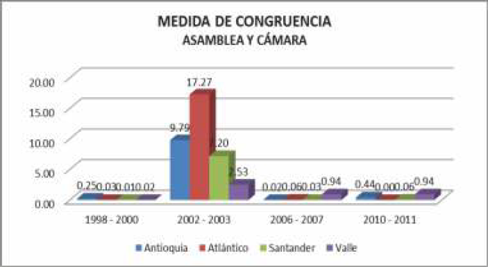 Haciendo uso de la Medida de Congruencia de Gibson y Suárez-Cao (2010) se calcularon los niveles de nacionalización vertical en cada uno de los sistemas subnacionales analizados14. De esta forma, se agruparon en pares los tipos de elección con el fin de apreciar los efectos de la norma para los diferentes niveles (Asamblea–Cámara, Concejo–Cámara y Concejo-Asamblea).