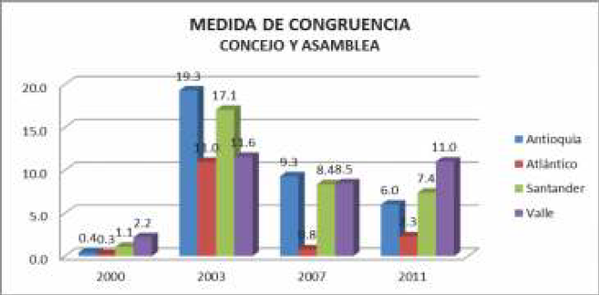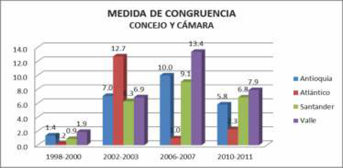 En igual medida, se observó que a pesar de la baja congruencia en Concejo-Cámara y Concejo-Asamblea después del cambio normativo, hubo matices entre los diferentes sistemas subnacionales. En ambos esquemas, de 2006 a 2011, Atlántico fue el departamento que ostentó más congruencia, aunque sus niveles siguieron siendo bajos al compararlos con los obtenidos antes de 2003, lo cual coincide con la ilación en los resultados del NEP por tipos de elección; mientras Valle fue el departamento con menor congruencia. Lo anterior prueba que pese a existir una tendencia en los resultados, la reforma afectó de manera diferenciada a cada territorio estudiado, debido en parte, a las particularidades que en términos políticoestratégicos y socioculturales se presentan en ellos, por lo que para comprenderlas en profundidad en cada caso, resulta necesario abarcar aspectos como el tamaño de la circunscripción, la cantidad de facciones de un partido, la organización interna, el número de municipios de cada departamento, el tamaño del censo electoral, entre muchos otros factores.