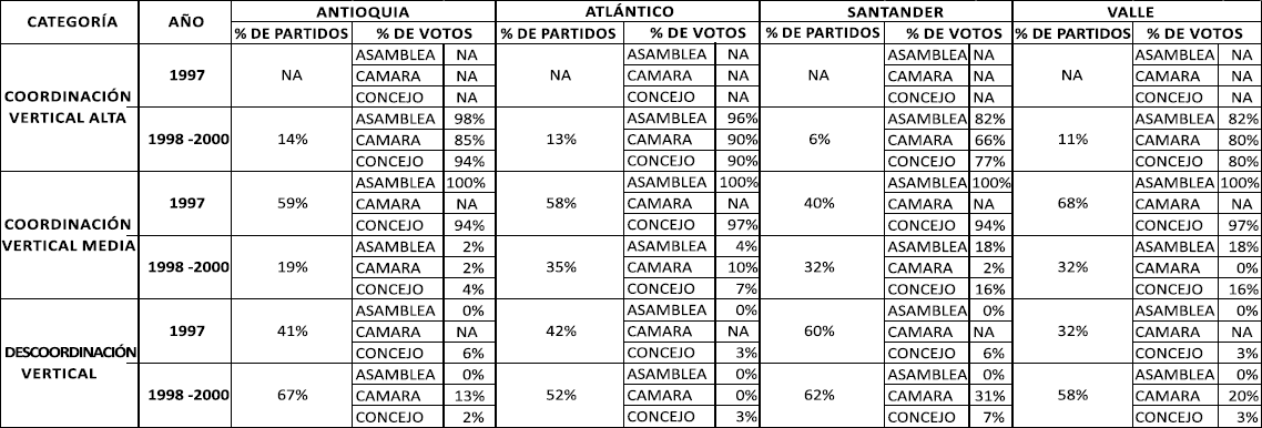 Como consecuencia de lo anterior y en comparación con el primer año de la reforma, el porcentaje de partidos de coordinación vertical media disminuyó considerablemente en estos mismos años, al igual que la cantidad de votos que obtuvieron estos partidos en los ámbitos regionales (Asamblea y Concejo). Este es un resultado importante, ya que muestra que la consolidación nacional de las facciones regionales dejó un espacio vacío que no ocupó ningún partido.