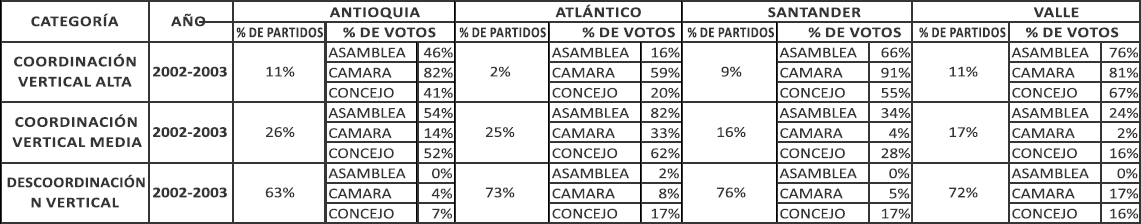 De esta manera, si se confrontan las tablas uno y dos, se podrá observar cómo los partidos de coordinación vertical alta pierden votos en las elecciones de Asamblea y Concejo en comparación con el periodo anterior, mientras que los partidos de coordinación media comienzan a capturar una masa importante de votos en estas mismas elecciones y los partidos sin coordinación hacen lo mismo pero sólo en Concejo.
