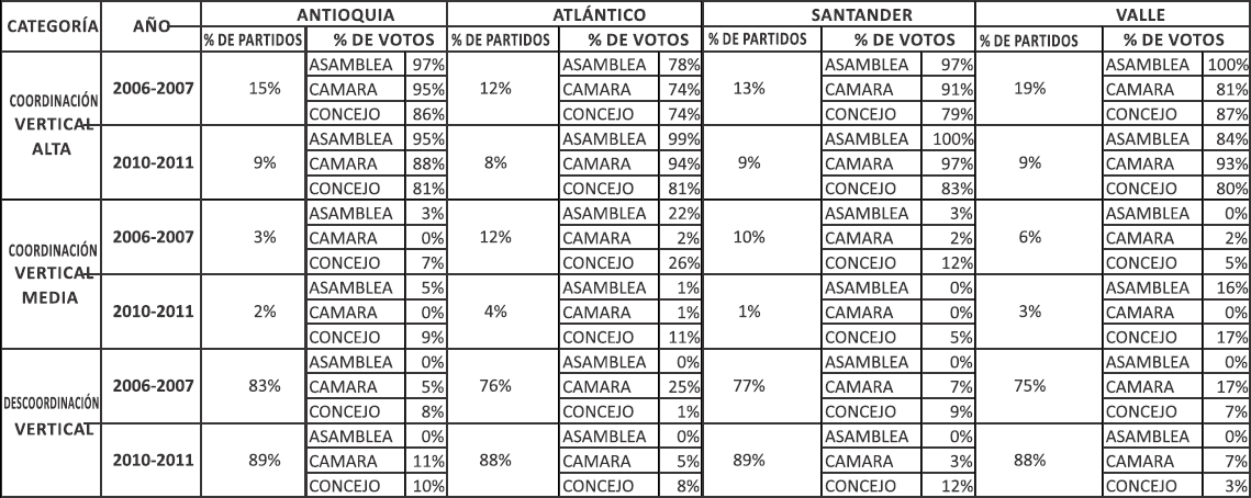 Después del golpe al tablero que dio la reforma a la coordinación de los partidos, el acoplamiento de los mismos a las nuevas condiciones no se produce de manera inmediata. Entre 2006 y 2007 muchos de los transicionales lograron penetrar en todos los territorios seleccionando listas en todos los niveles, aumentando con ello la cantidad de partidos con una coordinación vertical alta (ver tabla 3). Sin embargo, por efectos del umbral, este porcentaje se redujo considerablemente para las elecciones siguientes, ya sea porque algunos movimientos se fusionaron para hacer frente a esta medida (como Alas y Equipo Colombia y la fusión de diversos partidos progresistas con Verde Oxígeno o con el Polo Democrático Independiente que dieron origen el Partido Alianza Verde y El Polo Democrático Alternativo) o por la desaparición de muchos otros. Adicionalmente, los resultados muestran que esta depuración de partidos significó un aumento en la capacidad electoral de los partidos con integración vertical alta que vuelven a acaparar más del 80% de las votaciones en todos los niveles, pero en un escenario con menor fragmentación.
