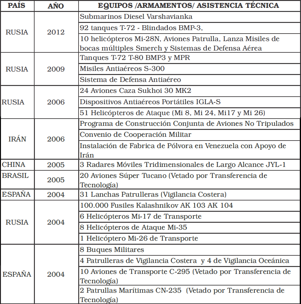 Más aún, paralelo a la tendencia de militarizar lo civil, el país ha experimentado un proceso sostenido de aumento en la compra de armamentos, dispositivos y demás, suscripción y compra de armamento militar, incluyendo aviones caza sukoys, radares, lanzacohetes, tanques de guerra, fusiles tipo Kalashnikov rusos, y baterías antiaéreas, patrulleras, helicópteros de ataque, municiones, cifras estas en incremento en el período (2004-2012) que pareciera estuviésemos en plena bipolaridad o más aún en un conflicto o guerra. (Véase Tabla 1).