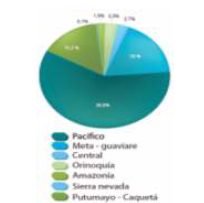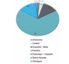 The UNODC in its report published in 2015 sustained that the concentration of coca cultivars in indigenous resguardos was present in the Pacific region with one of the highest percentages of 58,8% followed by the Meta- Guaviare region with 18%; the Putumayo- Caquetá region with 15,2%; the Orinoquía region with 3,3%; the Central region with 2,7%; the Amazonía with 1,9%; and finally, the Sierra Nevada region with 0,1% (UNODC; 2015, p.44) (Figure 1). In its following report published in 2016, the UNODC sustained that there was no significant change evident in terms of the reduction of the coca cultivars in resguardos in total; these cultivars remain being perceived as threat for the government in terms of the security of the country. There were regions in which resguardos are present that could reduce the cultivation of coca in a small percentage in comparison to the ciphers presented in 2015 but in terms of the entire country we observe that the tendency of augmenting continued. The newest report indicated that the highest percentage is in the Pacific region with 68,8% followed by the Putumayo-Caquetá with 14,0%, the Guaviare- Meta with 12,0%, the Central with 3,3%, the Amazonía with 1,3%, the Orinoquía with 1,3%, and the Sierra Nevada with 0,1% (UNODC; 2016, p.41) (Figure 2).