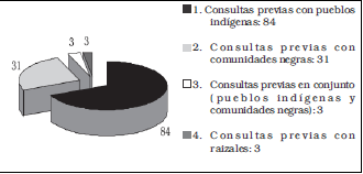 According to Gloria Amparo Rodriguez, who quoted in her study information from the actual Colombian Ministry of Environment and Sustainable Development referred in her study as the former Ministry of Environment, Housing, and Territorial Development “since 1994 until July of the present year [2009], the Ministry… had realized a total of 121 consultations, from which of them 84 have been with indigenous people, 31 with Afro-descendant communities, in 3 cases there have been consultations with both groups and 3 with raizal communities (Figure 3)” (Rodriguez, 2009, p. 61) and as it is observed in the next figure in her study the Ministry of Environment has maintained a record of the consultation processes made to all the communities involved in the projects of the government despite the results are low in number.
