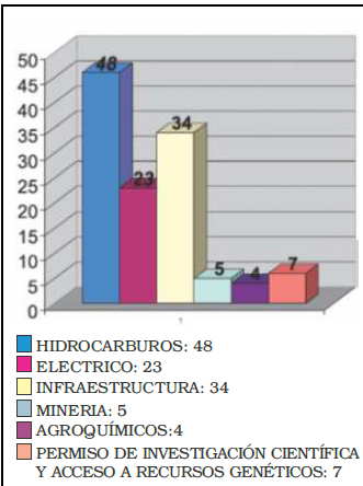 As stated by the same author, Rodriguez, depending on the sectors and types of activities in the need for consultations to the indigenous communities up to 2009 the consultation processes “have been effectuated in the following way: Hydrocarbons 48 , electric 23 ,infrastructure 34, mining 5, agrochemicals 4, and permissions of scientific investigation and access to genetic resources 7” (Rodriguez, 2009, p. 61) and as it is observed in the following Figure 4 the author points out that the prior consultation has been catalogued depending on the sectors that the government desires to exploit on these territories.