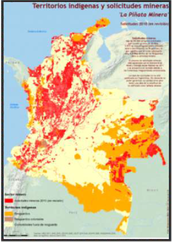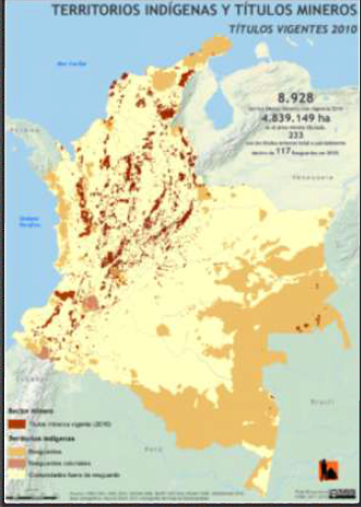 By the beginning of Santos' administration, the mining concessions were conceded to several more multinational and private companies which settled their operations in the indigenous resguardos in the quest for resources and as it is observed in the maps (figure 5 and 6) presented by the organisation Geoactivismo the number of companies waiting for the government's approval doubled and almost quadrupled the already present by 2010. This means that the government in its rush for achieving development has attempted to explore the whole territory unremittingly in order to gain profits.