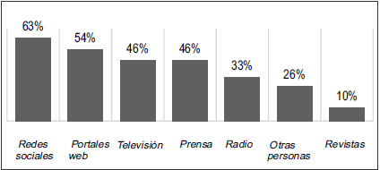 Al indagar sobre los medios por los que se informan los encuestados, se observa el tránsito generacional de los medios tradicionales hacia los medios y dispositivos digitales, lo que no necesariamente implica nuevas fuentes de información. El 63% de los encuestados se informa a través de redes sociales y el 54% a través de portales web, medios de naturaleza digital. La televisión y la prensa aparecen con un 46% y radio con un 33% (Ver figura 2).
