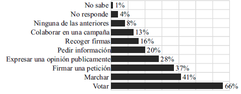 La información y la socialización política no activan la participación política, es más, en sí mismo el hábito de informarse o de hablar de política con otras personas no es considerado como una actividad política. Al respecto un estudiante afirmaba que “Uno a veces se informa sobre estos temas porque le van a preguntar en clase o para no quedar mal con los amigos que si saben del tema y viven hablando de eso” (Estudiante de Derecho y Filosofía, Universidad de La Sabana, Hombre 20 años. Comunicación personal abril 17 de 2017).