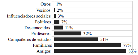 De la mano de la información política y la participación, se averiguó por los hábitos de socialización política, más exactamente por la costumbre de hablar de temas políticos con otras personas. Sigue siendo curioso que, a pesar de que los niveles de interés por los temas políticos no son muy altos, sí existe una correspondencia entre el informarse sobre política y hablar de ella.El 81% de los encuestados afirmó hablar depolítica con otras personas. Las personas conquienes más hablan de este tema son, quizás, conlas que más tiempo comparten los jóvenesuniversitarios: amigos 83%, familiares 77% ycompañeros de estudio 51% (Ver figura 4).