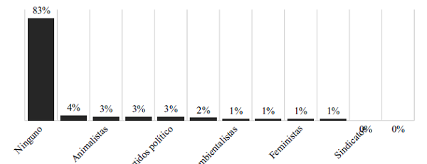 Otro aspecto que se estudió tiene que ver con los patrones de pertenencia organizacional en donde primero se interrogó por la pertenencia o no de los universitarios a distintos tipos de organizaciones (Ver figura 5), esto con el objetivo de no desvirtuar la existencia de preocupaciones y causas a defender por parte de los jóvenes, sino tratando de determinar si dichas demandas y reivindicaciones encontraban canales organizados de expresión y movilización. Al respecto se encontró que el 83% de los encuestados afirman no pertenecer a ningún tipo de organización. Las organizaciones que aparecen con algún grado de pertenencia son las culturales con 4%, animalistas 3%, religiosas 3% y partidos políticos 3%. Esto contrasta con lo que se ha observado en los últimos sucesos políticos del país, en los que los jóvenes han sido protagonistas de grandes debates y movilizaciones públicas sobre temas de diversa naturaleza como los derechos de los animales, la libertad religiosa y ladiversidad sexual, entre otros.