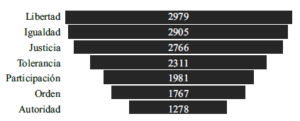 Al tratar de establecer algún vínculo entre ideología y afinidad partidista, y dado el bajo nivel de afinidad con los partidos, se planteó una interrogante relacionada con una escala de valores que pretendía tomar conceptos vinculados con los principios de las ideologías políticas para establecer un “ranking” de importancia de valores.