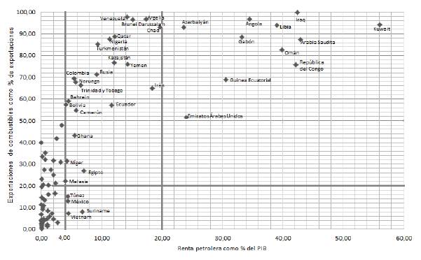 Un primer paso metodológico necesario es identificar los países con dependencia petrolera, para lo que se utiliza un procedimiento de análisis tipológico. Este implica dos tipos de operación articuladas en un mismo acto de investigación: la tipología como operación clasificatoria formulada o construida teóricamente y la tipología como operación técnica de construcción empírica a través del tratamiento de una matriz de datos (López, 1996). El presente trabajo se enfoca en el primer tipo de operación, sin dejar de atender la multiplicidad de datos de tipo sociopolíticos disponibles que permitan identificar tendencias, continuidades y discontinuidades. Por ello, después de elaborar como categoría general «países con dependencia petrolera», se definen subconjuntos más específicos a partir de la interrelación de dos variables (renta como porcentaje del PIB y exportaciones de combustibles como porcentaje del total de exportaciones). Cada uno de estos subconjuntos sería un tipo hipotético cuya operatividad ha de explorarse y verificarse en procesos de investigación posteriores. Sin embargo, se puede observar que los subconjuntos definidos operan para distinguir tendencias, permitiendo diversas posibilidades analíticas para los estudios sociopolíticos.