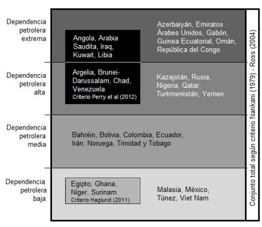 Frente a los criterios de Ross se han propuesto fórmulas alternativas. Por ejemplo, en la década de 1970, Gobind Nankani (1979) presentó el concepto «economía mineral», señalando que corresponde a aquellos países con no menos de un millón de habitantes en los que la producción mineral, incluído el petróleo, representaba, al menos, el 10 % del PIB y el 40 % de las exportaciones de mercancías. Más recientemente, Birdsall y Subramanian (2004) hablan de «países ricos en petróleo», tomando como parámetro que tengan al menos 30 % de ingresos por exportaciones petroleras. Por su parte, Haglund (2011) indicó que un país con dependencia mineral es aquel en el que los minerales representan al menos el 25 % de sus exportaciones tangibles. Por otro lado, Perry et al. (2012) subrayaron que un país con dependencia de recursos naturales sería aquel cuyas exportaciones en el sector representaran el 90 %. Como se puede observar, los criterios de Nankani (1979), Haglund (2011) y Perry et al. (2012) están dentro de los rangos establecidos por Ross. Por ello, es posible realizar, después de establecido el conjunto de países con dependencia petrolera, diferentes subconjuntos a partir de niveles de dependencia.