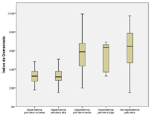 Según los índices, no existe ningún caso de regímenes democráticos entre los países con dependencia petrolera extrema y con dependencia petrolera alta (los casos de Federación de Rusia, Nigeria y Venezuela pueden generar intensos debates con respecto a esta aseveración). El 81,8 % son países con regímenes autoritarios y el 18,2 % se corresponden con regímenes híbridos. La situación es bastante similar entre los países con dependencia petrolera alta: 80,0 % son regímenes autoritarios y 10 % son regímenes híbridos (Brunei-Darussalam no fue considerado para el índice). Los países con dependencia petrolera media se distribuyen similarmente entre régimen autoritarios, híbridos y democráticos imperfectos, apareciendo por primera vez un país democrático pleno: Noruega. En el caso de los países con dependencia petrolera baja no hay regímenes democráticos plenos y la mitad de los países del subconjunto son países con regímenes democráticos imperfectos, distribuyéndose el resto de manera igualitaria entre regímenes autoritarios e híbridos.