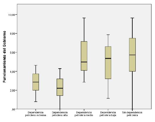 Al compararlas con otras variables, se observa que las diferencias entre los subconjuntos se mantienen. Por ejemplo, en lo relativo al sistema de gobierno, en todos los subconjuntos, se advierte una prevalencia generalizada de las repúblicas presidencialistas mayor al 40 % (el porcentaje más alto fue en el subconjunto de países con dependencia petrolera alta, 60 %). Por otra parte, el segundo sistema de gobierno que prevalece es diferenciado: monarquías absolutas (27,3 %) en los países de dependencia petrolera extrema, presencia similar de repúblicas semipresidencialistas y monarquías absolutas (20 % cada una) en los países con dependencia mineral alta, monarquías parlamentarias (28,6 %) en los países con dependencia petrolera media y repúblicas semipresidencialistas (28,6 %) en los países con dependencia mineral baja. Comparando algunas variables, el análisis exploratorio de datos permite observar las diferencias entre subconjuntos, algunas más notables (p.e. índice de Estado fallido y los componentes del índice de legitimidad de Gillie) que otras (p.e. índice de desarrollo humano).