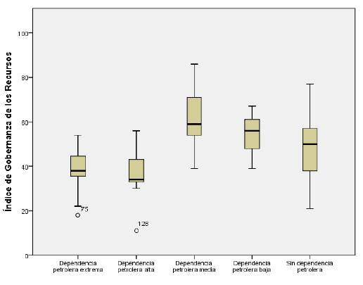 Haciendo un análisis exploratorio de datos, se puede ver que la representación de la distribución, tanto del índice de democracia (Figura 3) como de una de sus dimensiones, y el índice de funcionamiento del gobierno (Figura 4), muestra diferencias notables en cada uno de los subconjuntos seleccionados. Al considerar una variable distinta, el índice de gobernanza de los recursos elaborado por el Natural Resource Governance Institute (2017), las diferencias entre subconjuntos también son evidentes (Figura 5). En este sentido, es posible afirmar que los tipos construidos mantienen operatividad analítica y permiten comparar y analizar casos mediante análisis exploratorio de datos. Las diferencias en las tendencias ayudan a encontrar continuidades, discontinuidades y casos extremos (p.e. Libia y Turkmenistán en la Figura 5), con las cuales es posible hacer análisis tanto cuantitativos como cualitativos, así como aproximaciones de carácter teórico, histórico e institucional.