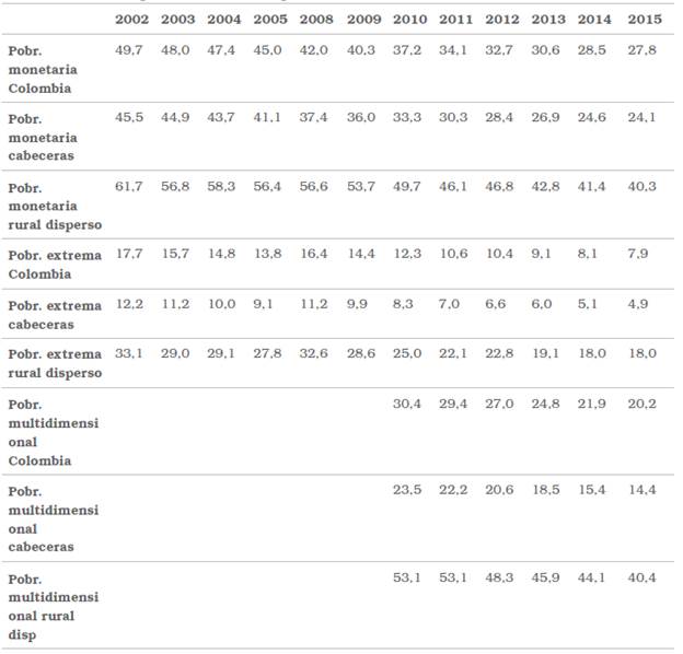En lo transcurrido del siglo XXI se ha evidenciado una reducción en las cifras de pobreza en el país. Según datos del DANE (2016), entre 2002 y 2015, se registró una disminución significativa de casi 21.9 puntos porcentuales en este indicador. Asimismo, los datos demuestran que, entre 2014 y 2015, la pobreza monetaria en Colombia pasó del 28.5 % al 27.8 %, lo que significó que 171 mil personas salieron de esta condición. En las cabeceras urbanas, la disminución también fue significativa: rondó los 21.4 puntos porcentuales entre 2002 y 2015, pasando del 49.7 % al 27. 8 %. Entre 2014 y 2015, la reducción fue de 0.7 puntos porcentuales en este indicador, lo que significó que más de 70 mil personas salieron de la pobreza. Por su parte, en el área rural, la pobreza monetaria también presentó tendencias decrecientes, de 21.4 puntos entre 2002 y 2015; entre 2014 y 2015, la reducción fue de 0.8, lo que conllevó que más de 101.000 personas mejoraron su condición en las zonas rurales de Colombia.