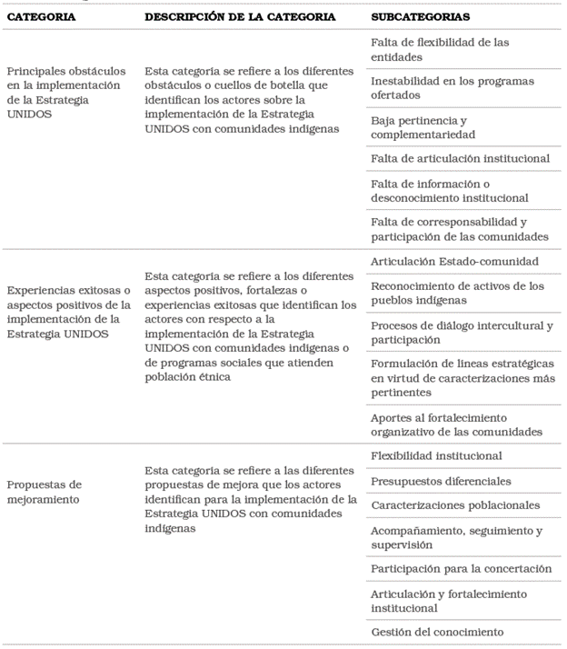 Para dar respuesta a dichos interrogantes, además de la revisión documental, se aplicaron 28 entrevistas a los diversos actores clave dentro del proceso de implementación de la Estrategia UNIDOS; entre ellos, hay representantes de entidades que pertenecen a la Red, funcionarios que hacen parte directa de esta e indígenas pertenecientes a seis pueblos ubicados en comunidades Uitoto, Tikuna, Cocama y Yagua, en Amazonas; Embera, en Antioquia, y Arhuacos, en el Magdalena.