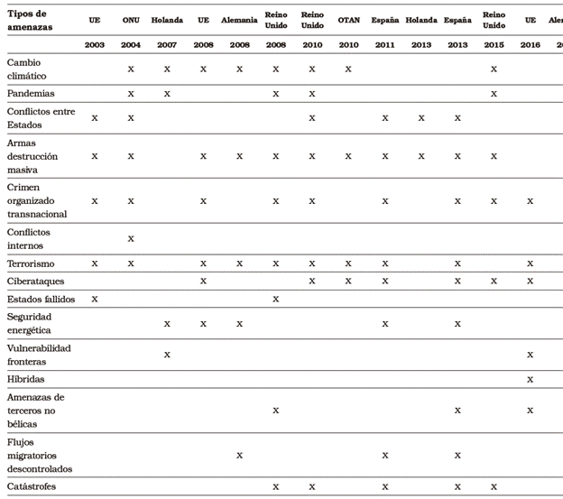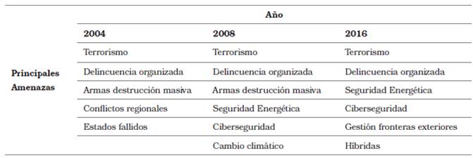Entre las amenazas que se afianzan en la última década está el ciberterrorismo y los flujos migratorios incontrolados. Igualmente, comienzan a reaparecer los conflictos entre Estados. Esta última se trata de una amenaza que estuvo muy presente a finales del siglo pasado por el conflicto de los Balcanes y que perdió relevancia a principios del presente siglo; sin embargo, la pretensión de ISIS de crear un Estado islámico y las guerras de expansión que ello ha generado ha hecho rebrotar la amenaza.