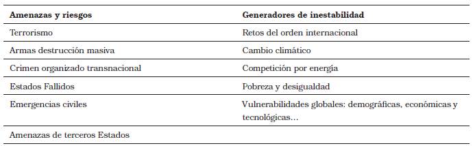 Concretados los principios, establece (Tabla 2) los riesgos y amenazas y los generadores de inestabilidad (drivers); en adición concreta, en cada caso, las respuestas con qué superar la hostilidad o inestabilidad. La ESN de 2008 entiende que la separación entre ellos -riesgos, amenazas y generadores de inestabilidad- es un tanto ingenua y se hace necesaria una respuesta integral. No se puede tratar como aislado lo que está interconectado.