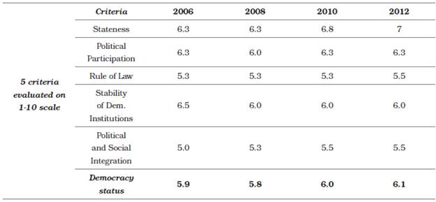 Tomando el primer criterio para analizar (Estado de Derecho), encontramos que este puede tener muchas connotaciones y formas en que entra su operacionalización dentro de la medición, por tanto, tomamos los argumentos de Leonardo Morlino (2008), quien dialoga con los postulados teóricos aquí expuestos, toda vez que no se toma el enfoque procedimental de la democracia en estricto sentido, sino es flexible y añade algunas interpretaciones que se apartan levemente de lo señalado por Dahl. Morlino (2008) establece que el Estado de derecho hace referencia al "principio de la superioridad de la ley...legum servi sumus (todos somos siervos de la ley)" caracterizado por la "retroactividad, publicidad, generalidad, estabilidad, claridad" ( p. 5), como elementos obligatorios en la defensa de esta, junto al control de la fuerza pública y la independencia del poder judicial. Para estudiar esta variable con respecto a Colombia en el gobierno de Uribe, tomamos el índice de transformación Bertelsmann Stftung (BTI) 3, quien hace una valoración de diversos aspectos, entre ellos, la democracia que posee una estrecha relación con el concepto de Estado de derecho antes establecido (como se puede ver en la Tabla 1):