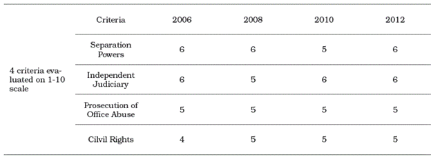 Con estos criterios, el índice de transformación (con respecto al estado de la democracia) establece unas categorías clasificando alrededor de 129 países de la siguiente manera: autocracias moderadas, democracias defectuosas y democracias muy defectuosas. Colombia, en el periodo de tiempo estudiado dentro del índice, se ubica entre los puestos 62 (2006), 70 (2008) y 60 (2010); allí siempre fue categorizada como democracia muy defectuosa, donde el tercer y quinto criterio poseen las calificaciones más bajas. De estos criterios contemplados en la Tabla 1, el que más tiene relación con la dimensión de Estado de derecho es Rule of Law (imperio de la ley), que se construye a partir de cuatro aspectos: Separation Powers (separación de poderes), Independent Judiciar y (poder judicial independiente), Prosecution of Office Abuse?4 (enjuiciamiento de abuso de la oficina) y Civil Rights (derechos civiles), en las que se obtuvieron los datos que se muestran en la Tabla 2: