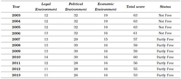 Para el análisis, el criterio de libertad de prensa se encuentra mejor ubicada dentro de estos conceptos, más específicamente en el Accountability Societal Vertical, establecido por O´Donnell (2004), con base en los estudios de Smulovitz y Peruzzotti, quienes percibieron que las acciones (en un sentido vertical) no podrían limitarse solo a lo electoral, sino a las posibles acciones que pueden exponer "errores gubernamentales, traer nuevas cuestiones a la agenda pública o activar el funcionamiento de agencias" (p.24), tanto como movilizar la opinión pública en momentos específicos; pueden provenir, como lo señala Morlino (2007), de medios de comunicación, asociaciones de ciudadanos, asociaciones empresariales o de cualquier otro tipo, etcétera (Smulovitz y Peruzzoti, 2000 y 2002, citado en O'Donnell, 2004; Levine y Molina, 2007). Por ello, al describir a los medios de comunicación como una herramienta de control y presión, se observa una relación más directa con el ejercicio del poder político, pues estos se pueden concebir como rivales y obstáculos potenciales, en el proceso de personalización del poder y así evidenciar el grado de libertad que tienen los medios de comunicación; al tiempo, establece la posición del poder personalista con respecto al funcionamiento libre de la prensa. Para revisar esta categoría en Colombia, recogemos los datos de Freedom House, no solo por ser una organización mundialmente conocida, sino por el grado de reconocimiento que se evidencia en los estudiosos de calidad de la democracia. Dentro de sus objetos de análisis, se encuentra el Freedom of the Press5, para abordar el tema de la libertad de prensa en la mayoría de países del mundo, donde se hace una medición con base en tres criterios de evaluación previamente establecidos6 (Freedom House, 2017). Para Colombia, a continuación, se presentan datos desde el año 2003 a 2013, en la que se pueden observar las calificaciones con respecto a la libertad de prensa, en los años del gobierno de Uribe Vélez, y algunos años posteriores (ver Tabla 3), para comparar lo que acontece cuando está un gobernante personalista en el poder y cuando no en esta categoría.