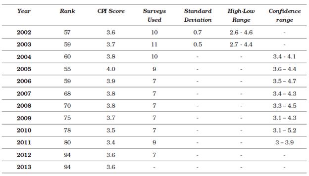 En relación con el apartado anterior, ahora pasamos a observar el tercer criterio “transparencia gubernamental”, desde la perspectiva del Accountability Horizontal, al que ya señalamos como la prevención, el control o castigo que se ejerce por parte de las principales organizaciones estatales, con suficiente autoridad, sobre la forma en como se está ejerciendo el poder político, respecto a acciones que pasan por encima de las leyes (O’ Donnell, 2004; Tusell, 2015), entre las que se encuentra la corrupción. Para ello, tomaremos los estudios realizados por Transparency International a través de su índice Corruption Perception Index, que arroja los siguientes datos durante el gobierno de Álvaro Uribe Vélez (ver Tabla 4).7