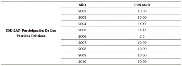 Al acercarnos a la tabla, podemos resaltar que, en la mayoría de los años (a excepción del 2004, 2005 y 2006), el parlamento posee un puntaje óptimo de desempeño en la participación de los partidos políticos. Pese a esto, es de destacar que en los estudios del IDD-LAT se tienen en cuenta sus observaciones con base en dos categorías: un parlamento monopartidista o altamente fragmentado, y son evaluadas con base en la recolección de información y observación propia de las organizaciones que diseñaron el Índice, por lo cual no es muy claro el cómo se llegó a dar dichos calificativos, dificultando así los análisis que tuviesen lugar aquí. Por tanto, en este criterio de competencia efectiva, es con respecto a los anteriores criterios donde menos podría verse la intromisión del expresidente Uribe.