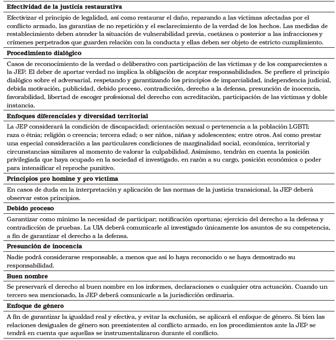 El 18 de julio de 2018 entró en vigencia la ley 1922, por medio de la cual se adoptaron reglas de procedimiento para la JEP, cuyos principios rectores regirán todas sus actividades y procedimientos. Esos principios se componen de los superiores constitucionales, y además por: