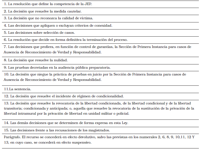 Ahora bien, frente a todas las resoluciones expedidas por las Salas y Secciones de la JEP, procede el recurso motivado de reposición. Asimismo, procederá el recurso de apelación sobre: