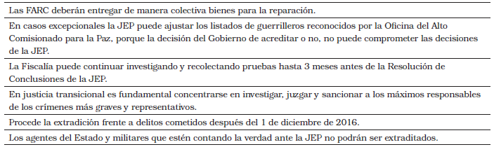 Dichas reglas de la Ley Estatutaria de la JEP cuestionadas por Duque, han sido ya de manifiesto constitucional por la Corte, especialmente en la sentencia previamente desacatada, así como por los fallos constitucionales emitidos en las sentencias C-674 de 2017 y C-007 de 2018. La sentencia C-674 de 2017 determinó la constitucionalidad del Acto Legislativo 01 de 2017, destacando la estructura del SIVJRNR.