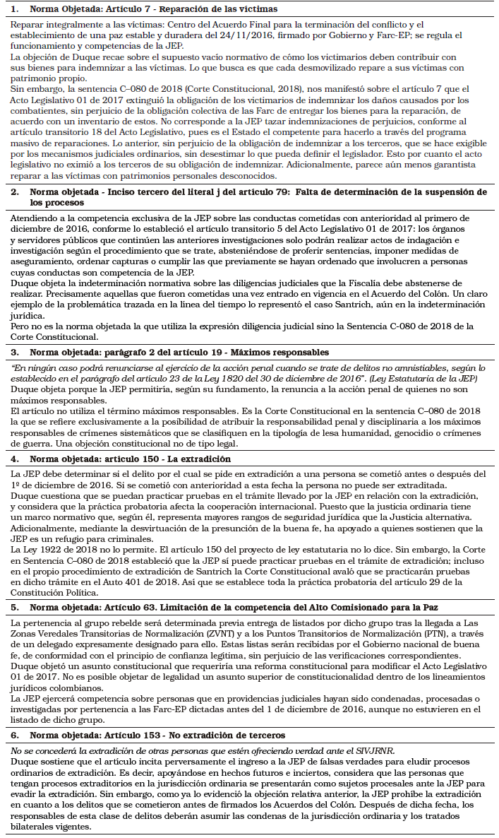 El proceso de aprobación y ratificación constitucional se interrumpió luego de que el Congreso y la Corte Constitucional aprobaran la ley estatutaria de la JEP; sin embargo, en el momento de la ratificación, el presidente objetó parcialmente la misma. Si bien es loable manifestar su preocupación ante la prevalencia constitucional de las normas internacionales ratificadas en materia de derechos humanos sobre el ordenamiento interno, debe respetarse lo ya manifestado por las Altas Corporaciones y no tratar de reformar constitucionalmente normas superiores del Estado para llevar a cabo revanchismos políticos, haciendo mofa de los supuestos beneficios de la justicia transicional otorgados a guerrilleros, y generando impunidad y olvido de la ineficacia en la definición jurídica de la jurisdicción ordinaria.