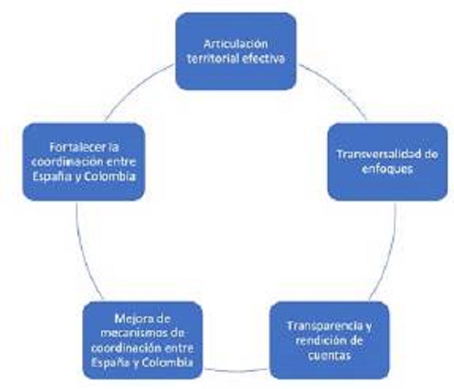 En efecto, a diferencia de otros actores y agendas de cooperación para el desarrollo en Colombia, que centraron sus esfuerzos técnicos y diplomáticos en ecuaciones asociadas a la pobreza, el narcotráfico y el terrorismo, el plan español ha sostenido un menú de complejos capítulos. Aquellos se suscriben más a una cooperación para el desarrollo desde flancos humanitarios, tejidos sociales, construcción de paz y apoyo a la implementación del acuerdo entre las extintas Fuerzas Armadas Revolucionarias de Colombia (FARC) y el Estado. En otras palabras, España ha logrado desenclavar el tema securitario como eje exclusivo de la cooperación y el desarrollo en Colombia.