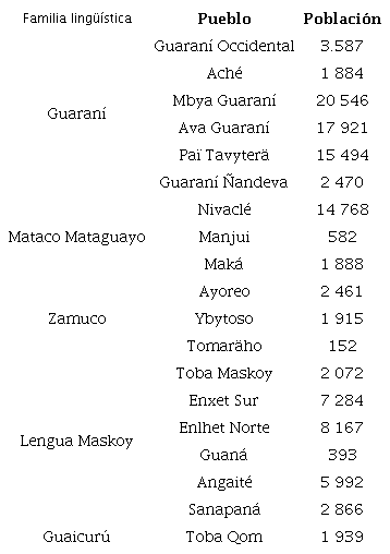 De acuerdo con el último Censo Nacional de Población y Viviendas para Pueblos Indígenas, realizado en 2012, la población indígena asciende actualmente a 117 150 personas. Datos más recientes de la última Encuesta Permanente de Hogares de 2017 indican que la población indígena ya llega a 122 461 personas. En total son 19 pueblos indígenas, agrupados en cinco familias lingüísticas, tal como puede apreciarse en la Tabla 1. El censo incluye a todas las personas autoidentificadas como indígenas, tomando como referencia el reconocimiento de su propia identidad, el origen común, la territorialidad y el factor lingüístico- cultural (DGEEC, 2012).