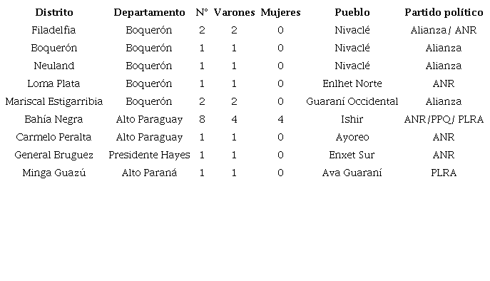 Asimismo, en los comicios municipales de 1996 varios indígenas de los pueblos Maskoy e Yshir fueron electos como concejales municipales en los distritos de Puerto Casado, Bahía Negra y Fuerte Olimpo, departamento de Alto Paraguay. Y en el municipio de Mariscal Estigarribia, departamento de Boquerón, también fueron electos indígenas de los pueblos Nivaclé y Guaraní Occidental (Agüero et al, 2017).