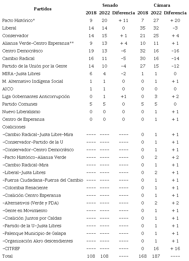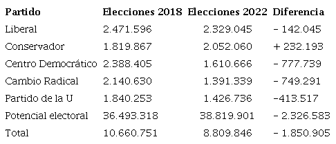 En medio de la crisis de confianza la mayoría de los partidos disminuyó su votación y sus curules, con excepción del partido Conservador (que aumentó el 12 %, cuyos políticos regionales se han favorecido del colaboracionismo con todos los gobiernos en las últimas décadas). Aunque el potencial electoral aumentó en 2.326.583 electores, en conjunto estos partidos que eran de la coalición de Gobierno disminuyeron en 1.850.905 electores. Lo mismo sucedió con los partidos cristianos MIRA y Colombia Justa Libres (juntos sumaron en 2018 un total de 662.185 votos, y en 2022 obtuvieron 289.929 votos en la Cámara). En curules sucedió igual y juntos pasaron de 93 a 67 curules en Senado y de 156 a 105 en la Cámara. Estas pérdidas de curules fueron ganancia para otros partidos