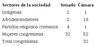 La mayor pluralidad también se expresa en la presencia de minorías étnicas. En esta elección participaron 7 organizaciones7 y obtuvieron curules Autoridades Indígenas de Colombia (Polivio Leandro Rosales) y el Movimiento Alternativo Indígena Social (Aída Marina Quilcué), que también ganó el escaño en la Cámara de Representantes (Norman David Hanoi). Así mismo, las minorías afrocolombianas hacen parte del Congreso y cuentan con dos curules exclusivas en la Cámara de representantes. Estas minorías se han caracterizado por su gran fragmentación y en estas elecciones se presentaron candidatos en las listas de 48 organizaciones y consejos comunitarios con reconocimiento legal. Fueron elegidos dos candidatos con nexos con políticos y partidos tradicionales que les dieron una gran ventaja frente a las organizaciones auténticamente vinculadas a comunidades locales de afrocolombianos. Una curul fue para Ana Rogelia Monsalve Ãlvarez, quien logró el aval del Palenque Consejo Comunitario de la Vereda las Trecientas y del Municipio de Galapa8, y la otra para Miguel Abraham Polo Polo, avalado por el Consejo Comunitario Femando Ríos Hidalgo (este personaje ha sido integrante activo del partido Centro Democrático y en esta oportunidad apeló a su identidad étnica para sobrevivir en la competencia electoral ante las dificultades de su partido).9