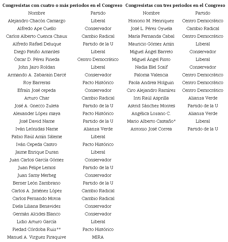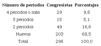 El grado de renovación en el Congreso se expresa también cuando se agrupa a los congresistas según el número de periodos que llevan en sus curules (en una o en ambas cámaras). En concordancia con los altos niveles de renovación, quienes solo llevan un periodo en el Congreso representan el 68,5 % (203 congresistas) y las otras tres categorías en conjunto suman 31,5 %. Son muy pocos los congresistas que se mantienen por tres o por más periodos; sin embargo, son muy poderosos, especialmente quienes hacen parte del núcleo estable de políticos regionales que se han anclado en sus posiciones de poder, cuentan con amplias clientelas electorales y ejercen influencia en sus departamentos y a nivel nacional. Aquí se incluyen 28 congresistas con cuatro o más periodos y 15 que llevan tres periodos y se están consolidando. En total el 14,9 % de los congresistas son políticos que se pueden considerar muy estables y cada vez con más poder.