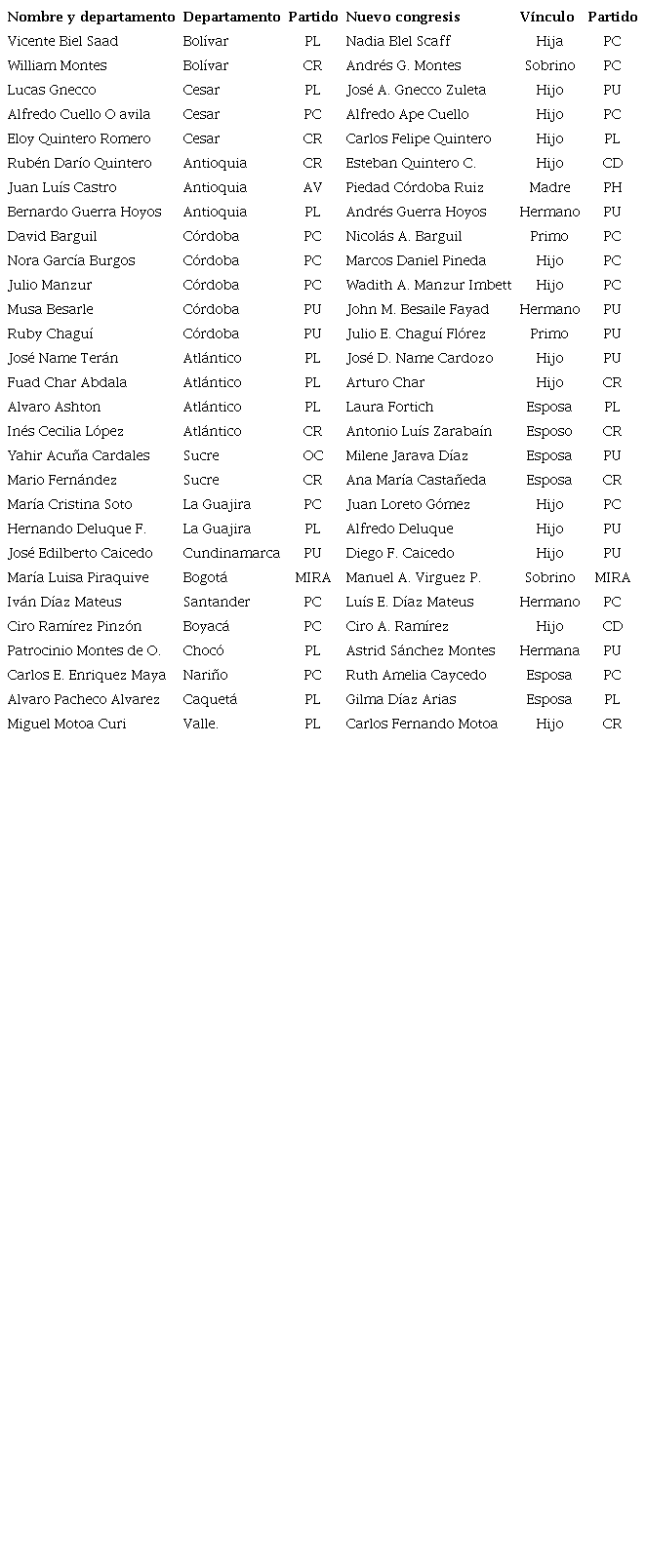 Asimismo, como es propio del clientelismo, la competencia interna en las redes de clientela hizo que en muchos casos los subjefes construyeran sus propias facciones o movimientos y se separaran de su antigua jefatura, incluso le compitieran al patrón político. A su vez, se dio una renovación generacional por las edades de los viejos políticos, muchos de ellos fallecieron después de ocupar sus curules ocho o nueve o más veces, algunos se retiraron y fueron reemplazados por nuevos liderazgos y otros se retiraron más jóvenes16 (como se verá más adelante, en algunos departamentos ha habido renovación de nombres, pero dentro de los clanes políticos).