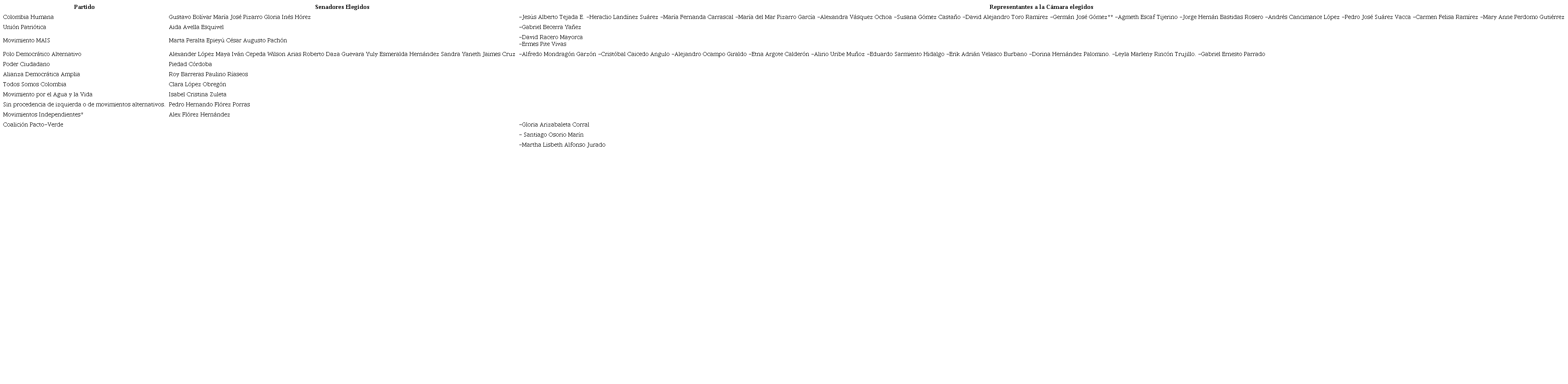 El pacto Histórico se convirtió en el partido con más curules en ambas cámaras (20 senadores y 27 representantes a la Cámara), además de las curules en coalición (Pacto Histórico-Alianza Verde 2 curules en la Cámara y movimiento alternativos, una coalición de la Alianza Verde y el Polo Democrático Alternativo, 2 curules). Entre sus elegidos predominan nuevos liderazgos, personas que llegan por primera vez al Congreso, aunque también hay políticos que han militado en partidos tradicionales como Roy Barreras, Piedad Córdoba y Clara López Obregón.