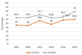 La renovación es el porcentaje de los congresistas nuevos en cada elección en la respectiva Cámara.15 En la Cámara la renovación fue del 79 % y en Senado del 60,2 %. En las últimas seis elecciones ha sido más alta en la Cámara que en el Senado (en promedio del 68,1 % Cámara y 53,6 %) Senado. Así está registrado en el gráfico 2.